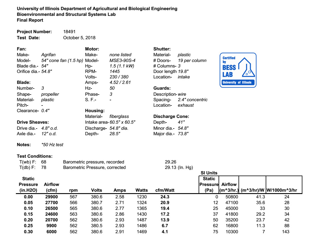 靜壓0.1英寸水柱下的風(fēng)量是極其重要的,因?yàn)樗切笄萆岘h(huán)境下風(fēng)機(jī)的運(yùn)行環(huán)境壓力。風(fēng)機(jī)的性能數(shù)據(jù)通常是靜壓0水柱,但在實(shí)際運(yùn)用過程中很少用到。作為通風(fēng)設(shè)計(jì)標(biāo)準(zhǔn),養(yǎng)豬手冊(cè)和養(yǎng)牛手冊(cè)提供了在寒冷、溫和和炎熱氣侯下的通風(fēng)比率。選持合適的風(fēng)機(jī)才能滿足這些需求。