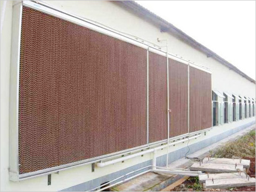 ZR濕簾降溫系統(tǒng)的降溫過(guò)程是在基核心-ZR紙墊內(nèi)完成的。在波紋的纖維紙表面有層薄薄的水膜,當(dāng)室外干熱空氣被風(fēng)機(jī)抽吸穿過(guò)紙墊時(shí),水膜上的水會(huì)吸收空氣中的熱量進(jìn)而蒸發(fā)在水蒸氣,這樣經(jīng)過(guò)處理后的涼爽濕潤(rùn)的空氣就進(jìn)入室內(nèi)了。這自然的過(guò)程猶如風(fēng)吹過(guò)水面一樣。