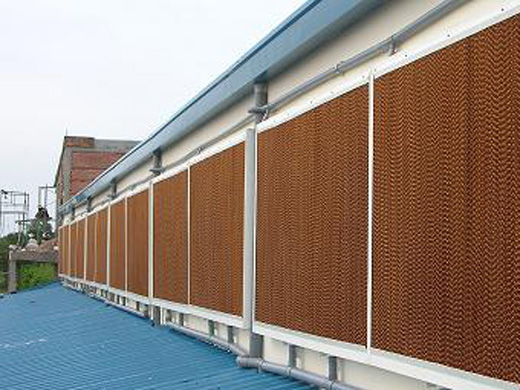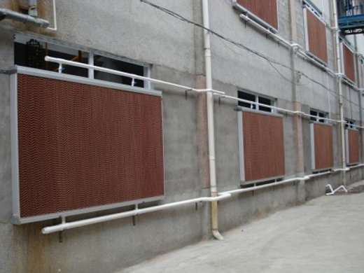 ZR濕簾降溫系統(tǒng)的降溫過程是在基核心-ZR紙墊內(nèi)完成的。在波紋的纖維紙表面有層薄薄的水膜,當室外干熱空氣被風(fēng)機抽吸穿過紙墊時,水膜上的水會吸收空氣中的熱量進而蒸發(fā)在水蒸氣,這樣經(jīng)過處理后的涼爽濕潤的空氣就進入室內(nèi)了。這自然的過程猶如風(fēng)吹過水面一樣。